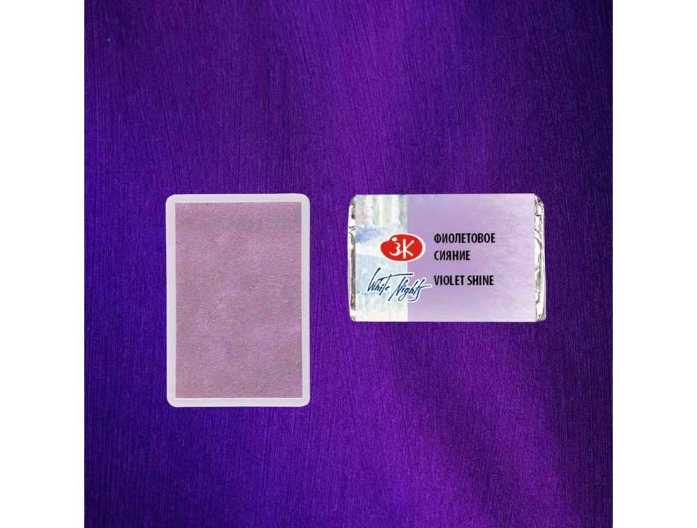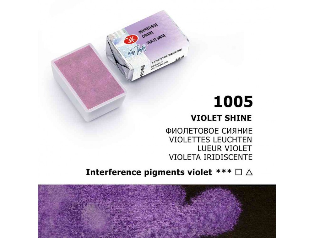 Brilho violeta baseado em pigmento violeta de interferência. Crie um brilho violeta perolado transparente em papel branco que aparece quando você muda o ângulo de visão ou a luz. Ideal para misturar com as cores da paleta principal ou sobrepor o tom principal. Ao trabalhar em papel preto, proporciona um tom roxo intenso, com brilho perolado.