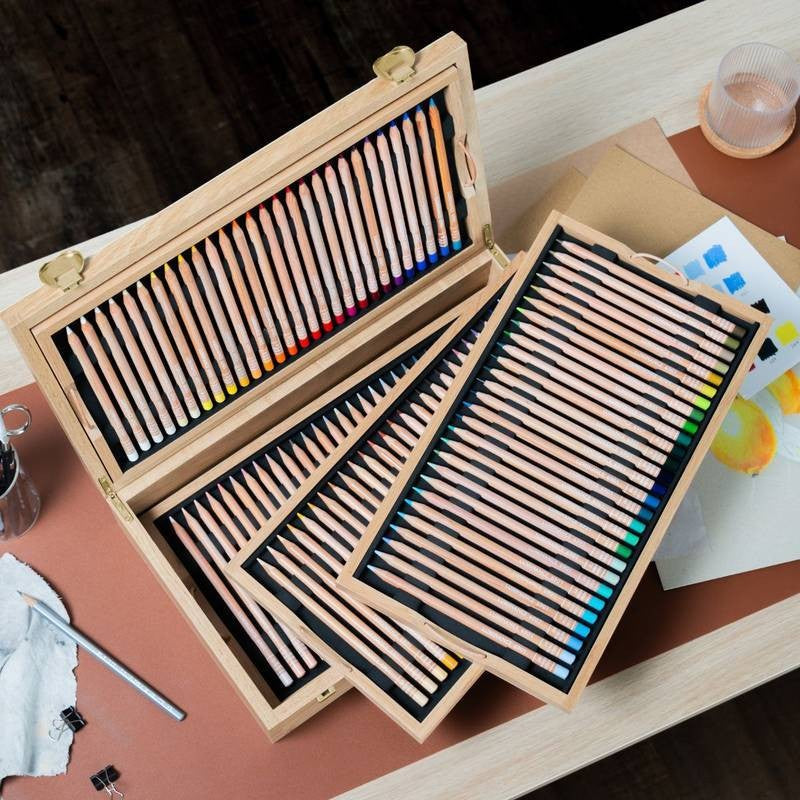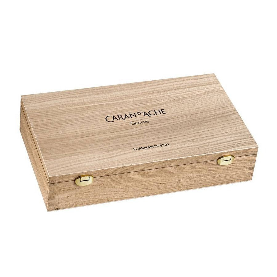 A Caran d’Ache apresenta um estojo de madeira em carvalho claro que abriga a linha de lápis de cor Luminance 6901™, fabricada em Genebra. O estojo inclui 100 cores, sendo nove delas duplicadas, além de dois lápis blender e um full blender, totalizando 112 lápis.